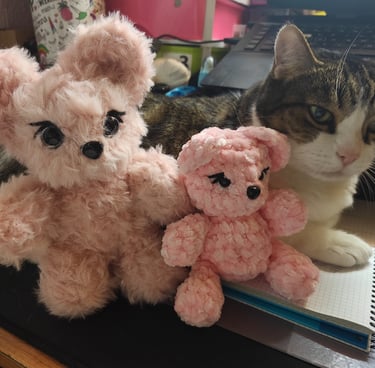 Para crear a estas ternuritas suelo utilizar dos materiales que me recuerdan a mi niñez, uno es el chenille, esos muñecos super suaves que usaba para dormir y el otro es el " pelo peluche" ¿ quién no ha tenido un muñeco con esa textura y se lo ha llevado abrazado a todos lados?.